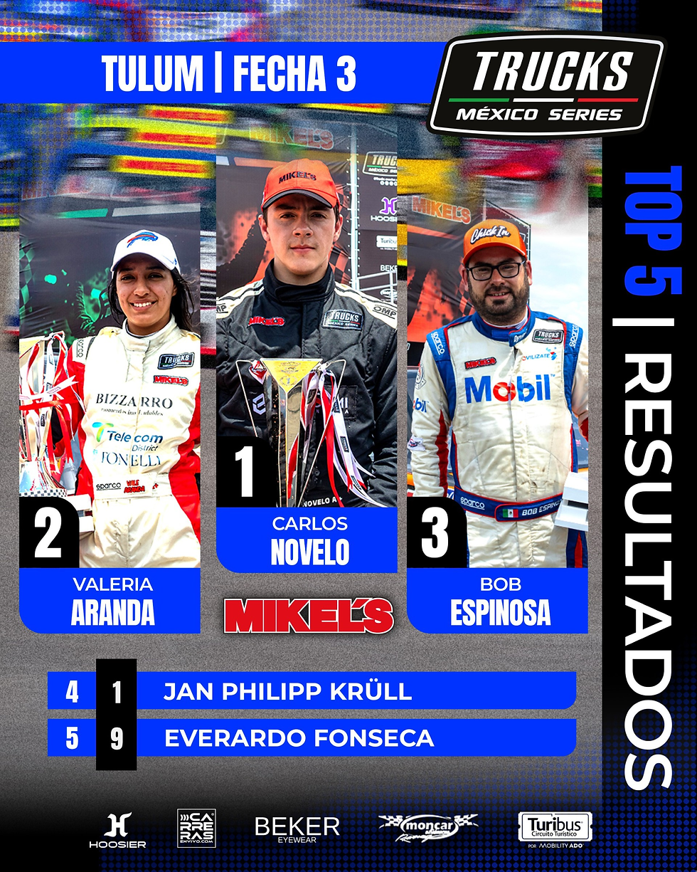 Carlos Novelo dominó un nuevo y emocionante mano a mano frente a Roberto Espinosa para conseguir su segunda victoria consecutiva en la Fecha 3 de Trucks México Series presentada por Mikel’s - Moncar - Turibus - Beker Eyewear - Hoosier Tire México - Carreras en Vivo, en una competencia marcada por los contactos, la paciencia y la estrategia en el óvalo del Aeropuerto Internacional de Tulum.